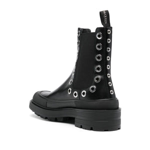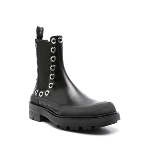 eyelet-detail Chelsea boots from Alexander McQueen featuring jet black, silver-tone hardware, metal eyelet detailing, logo pull-tab at the heel, elasticated side panels, round toe, chunky rubber sole and pull-on style. Tread Slick leather chelsea boots Size and Fit - Heel 2 in / 5 cm