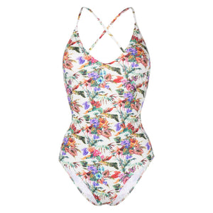 Mara floral-print scoop-neck swimsuit from ANJUNA featuring white/multicolour, stretch-design, all-over floral print, built-in cups bra, scoop neck, multi-way strap design and spaghetti straps. Be mindful to try on swimwear over your own garments.. Mara printed one piece swimsuit Size and Fit - This piece fits true to size. We recommend you get your regular size. Model is 1,75m / 5ft 8in wearing size S