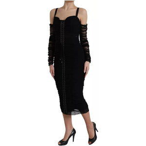 فستان دولتشي آند غابانا أسود مكشوف الكتفين من التول المطاطي متوسط الطول