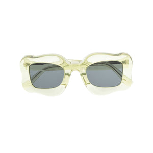 oversized curved-frame sunglasses from Bonsai featuring green tea, transparent design, oversize frame, curved corners, tinted lenses, logo print at the arm and straight arms. These glasses come with a protective case.. Happy sunglasses Size and Fit - Arm Length: 14.5 Centimetres. Bridge Width: 2.7 Centimetres. Lens Diameter: 4.8 Centimetres. Total Width: 13.5 Centimetres.