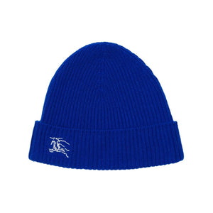 Equestrian Knight cashmere beanie from BURBERRY featuring royal blue, cashmere, ribbed knit, oval crown, signature Equestrian Knight motif, embroidered logo to the front and turn-up hem. Logo wool beanie