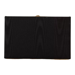 حقيبة يد صغيرة رائعة جديدة تمامًا مع البطاقات والعلبة، موديل أسود، مغطاة بقماش حريري كثيف. الحقيبة الصغيرة مغلقة بغطاء بإطار ذهبي.