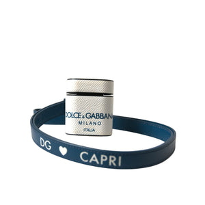 Dolce & Gabbana White Blue Calf Leather Logo Print Strap Airpods Case