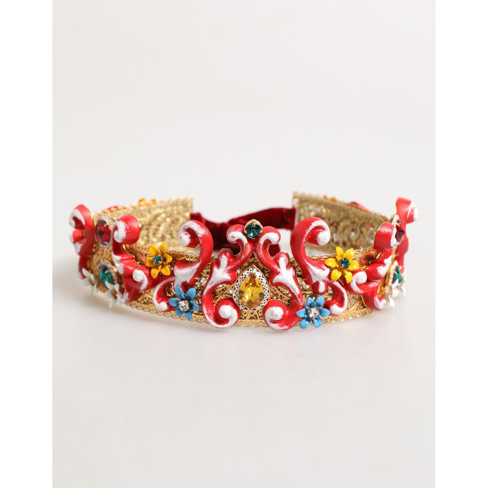 Absolutely stunning, 100% Authentic, brand new with tags Dolce & Gabbana headband, exquisitely handcrafted in Italy. Designed with red and gold filigree, multicolor crystals, and velvet ribbon tie closure. A true statement crown inspired by Sicilian heritage.