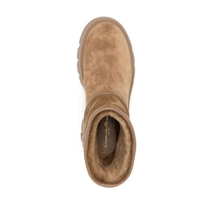camel brown calf suede faux-shearling lining slip-on style round toe branded insole chunky rubber lug sole Stormy suede ankle boots Size and Fit - Heel 2,4 in / 6 cm; Platform 1,4 in / 3,5 cm