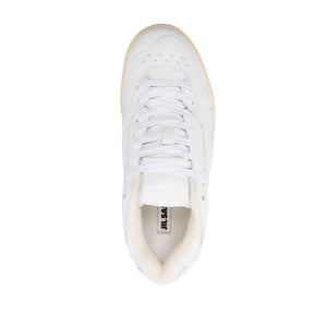 حذاء رياضي منخفض الساق من JIL SANDER بشعار منقوش، مصنوع من جلد العجل باللون الأبيض، وتفاصيل مثقبة، ومقدمة مستديرة، وقفل أمامي برباط، ونعل داخلي يحمل العلامة التجارية ونعل مطاطي مسطح. المقاس والمقاس - كعب 1,2 بوصة / 3 سم؛ نعل 0,8 بوصة / 2 سم