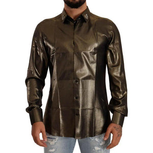 • Dolce & Gabbana Metallic Gold DG Embroidered Crown Silk Top Shirt