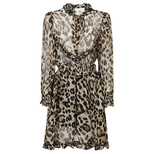 Short brown dress, V -neck with laces, long sleeves, with printing, elasticized with life, elastic cuffs, chemisier. Printed silk blend shirt dress Size and Fit - This piece fits true to size. We recommend you get your regular size. Model is 1,75m / 5ft 8in wearing size S