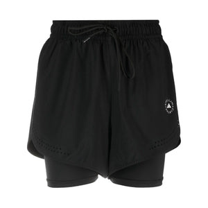 TruePurpose layered track shorts from adidas by Stella McCartney featuring black, recycled polyester blend, layered design, perforated detailing, logo print to the side, elasticated drawstring waistband, high-waisted and inner shorts. 2 in 1 shorts Size and Fit - This piece fits true to size. We recommend you get your regular size. Model is 1,75m / 5ft 8in wearing size S