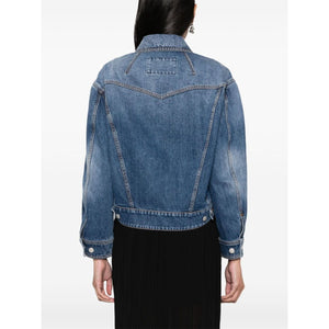 indigo blue cotton denim classic collar front button fastening two chest flap pockets long sleeves buttoned cuffs cropped Denim jacket Size and Fit - This piece fits true to size. We recommend you get your regular size. Model is 1,75m / 5ft 8in wearing size 40 (IT)