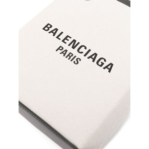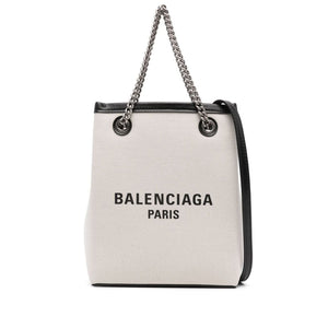 Phone Holder crossbody bag from BALENCIAGA featuring cotton blend, canvas, leather trim, logo print to the front, open top, two chain-link top handles, detachable shoulder strap, main compartment and light beige/black. We've partnered with Good On You — an independent agency that rates how brands perform in relation to their impact on the planet, people and animals, with a multi-criteria rating simplified to a five points scale. In order to be awarded our conscious label, larger brands need to score a minimum of four out of five ('Good'), while smaller brands must score at least three out of five ('It's a start'). This item comes from a brand rated four out of five ('Good') by Good on You. Please note, this is a brand-level rating and does not guarantee that this product is made with conscious materials.. Learn more about what makes a product Conscious on our Conscious Criteria page. Duty Free phone holder Size and Fit - Width 6,3 in / 16 cm Height 8,27 in / 21 cm Depth 2,76 in / 7 cm Handle 4,33 in / 11 cm Strap 43,31 in / 110 cm