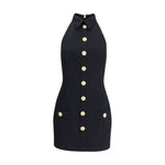 Balmain’s Sleeveless Short Dress is a garment with a structured cut and strong elegance. Featuring a classic collar and embossed buttons reminiscent of the house’s iconic style, it has two welt pockets on the front that add a touch of sophistication to the essential yet sophisticated design.