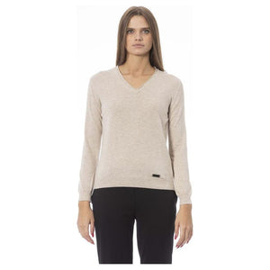 Wrap yourself in the sumptuous blend of sophistication and comfort with Baldinini Trend’s beige V-neck sweater. Meticulously crafted, this piece boasts a fine ribbed knit at the neck, cuffs, and bottom, ensuring a flawless regular fit. The discreet yet luxurious metal monogram adds a touch of the brand’s iconic flair. Perfect for those who seek an elegant ensemble that doesn’t compromise on coziness.