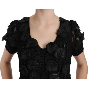 John Richmond Black Silk Leather Flowers Sheath Dress