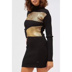 Unveil your fashion-forward spirit with this stunning long-sleeved knitted dress by Custo Barcelona. Crafted with an eye-catching laminated effect, this figure-hugging piece boasts a chic polo neck that exudes sophistication. The solid black hue ensures it’s a timeless addition to your wardrobe, creating a look that’s as versatile as it is glamorous. Perfect for those who dare to make a bold statement, get ready to captivate any crowd you step into.