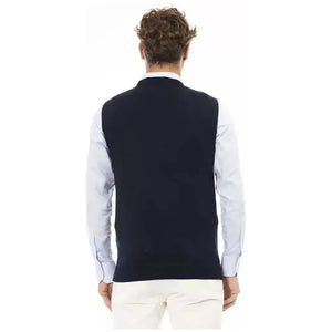 Indulge in the epitome of sophistication with Alpha Studio’s quintessential vest, a harmonious blend of style and comfort. This vest boasts a sleek V-neckline complemented by a finely ribbed knit collar and bottom, ensuring a regular fit that exudes effortless elegance. Crafted in Italy, each stitch reflects a legacy of luxury. The vest’s vibrant blue hue is a bold statement, perfect for the trendsetting aficionado. Step into the spotlight with an Alpha Studio creation that’s as timeless as it is trendy.