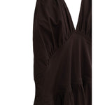 In brown cotton, crossover top, waistband, very wide skirt part, side slit. On the back, open back, zip closure.