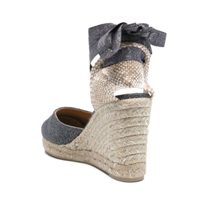 dark grey almond toe metallic threading branded leather insole high wedge heel braided raffia sole tie-fastening ankle strap Carina raffia wedge espadrilles Size and Fit - Heel 3,7 in / 9,5 cm; Platform 0,8 in / 2 cm