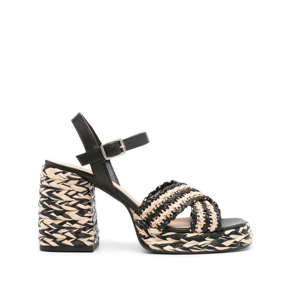 black/beige interwoven design crossover strap at the toe branded leather insole 100mm high block heel leather outsole buckle-fastening ankle strap Vicen raffia heel sandals Size and Fit - Heel 3,9 in / 10 cm; Platform 1,2 in / 3 cm