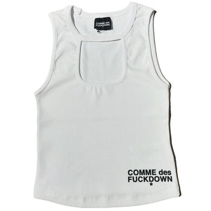 Elevate your style quotient with the audacious flair of Comme Des Fuckdown. This white cotton rib top blends the rebellious spirit with luxury, poised to make a statement with its daring chest opening and the brand’s iconic rubber logo print. Crafted in Italy, this piece promises not only trendsetting visual appeal but also supreme comfort with a touch of elastane for that perfect fit.