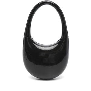 black open top embossed logo to the front single top handle Swipe shoulder bag Size and Fit - Depth 5 cm, Handle 16 cm, Height 13 cm, Width 17 cm