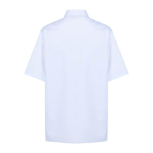 light blue cotton poplin texture embroidered logo at the chest straight-point collar front button fastening short sleeves chest patch pocket straight hem Oversized cotton shirt Size and Fit - This piece fits true to size. We recommend you get your regular size. Model is 1,75m / 5ft 8in wearing size S