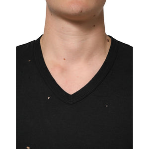Dolce & Gabbana Black Cotton Tattered Logo V-Neck Men T-shirt