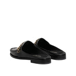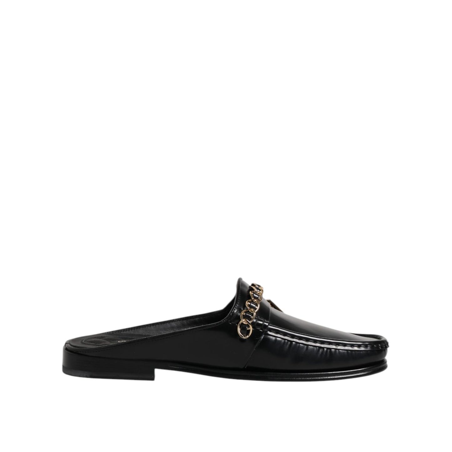 Gorgeous brand new, 100% Authentic Dolce & Gabbana slip on open-back shoes come in calfskin upper with a gold tone chain GD logo band.