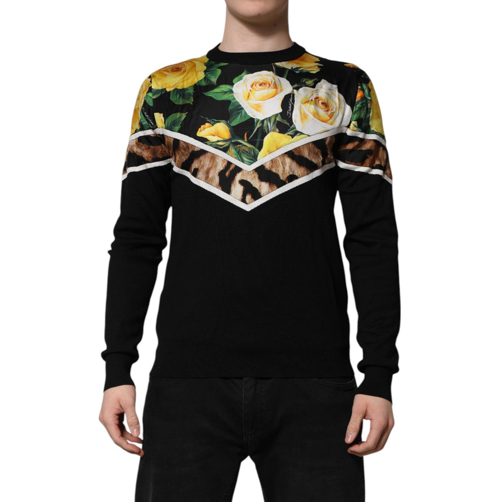 Dolce & Gabbana Black Silk Floral Crew Neck Pullover Sweater