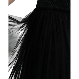 Gorgeous brand new with tags, 100% Authentic Dolce & Gabbana black evening dress with a low waistline. The bodice of the sleeveless model is made of openwork mesh, completely covered with glossy sequins. Features a multi-layered hem, they used translucent tulle, draped with small folds.