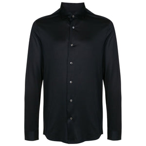 Navy blue cotton-lyocell blend straight-point collar front button fastening long sleeves buttoned cuffs curved hem Cotton shirt Size and Fit - This piece fits true to size. We recommend you get your regular size. Model is 1,84m / 6ft 1in wearing size M