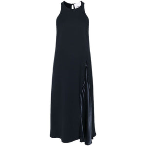 navy blue cady texture crew neck sleeveless satin trim straight hem mid-length single rear button fastening Sleeveless midi dress Size and Fit - This piece fits true to size. We recommend you get your regular size. Model is 1,75m / 5ft 8in wearing size 40 (IT)