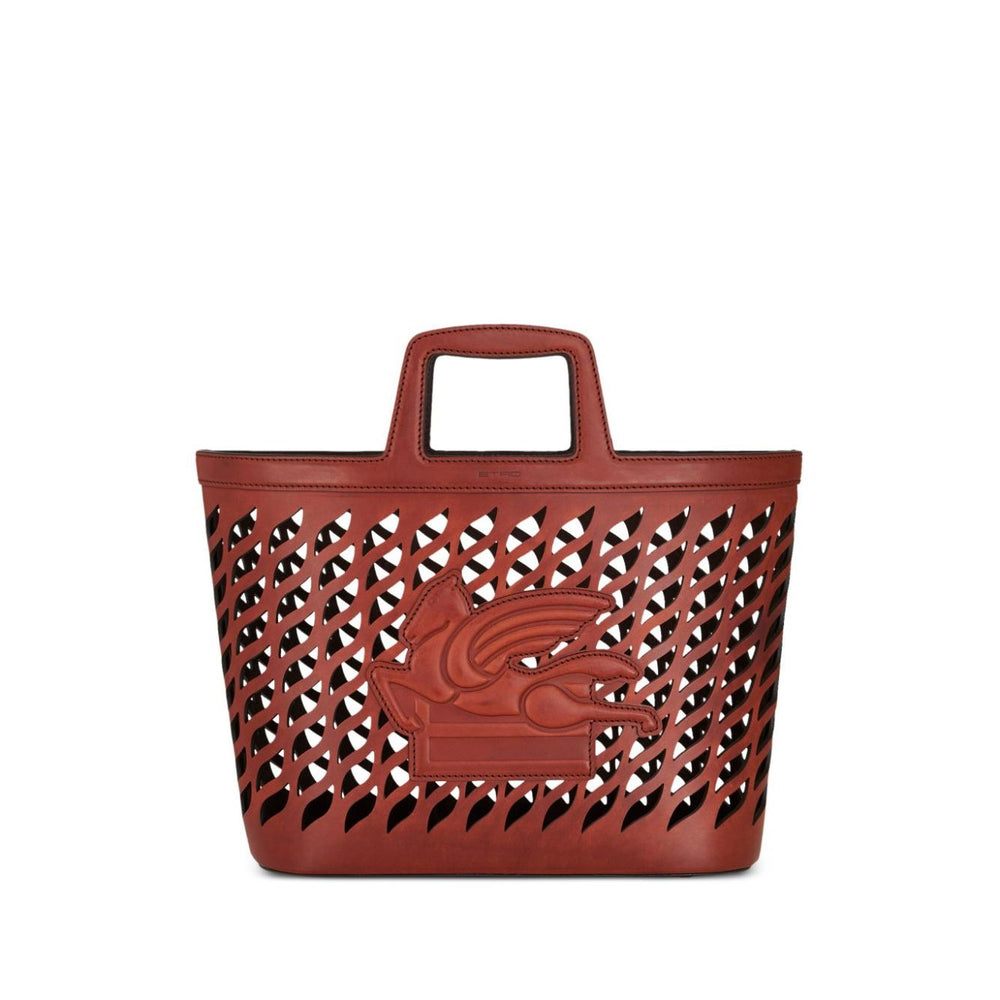 Pegasus shopping bag from ETRO featuring light brown, calf leather, embossed logo to the front, open top, circular top handles and main compartment. Perforated leather shopping bag Size and Fit - Width 13,39 in / 34 cm