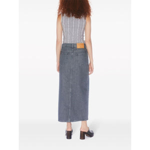 grey organic cotton denim appliqué logo front slit belt loops front button fastening classic five pockets maxi straight hem This item is made from at least 50% organic materials. Learn more about what makes a product Conscious on our Conscious Criteria page Slit denim long skirt Size and Fit - This piece fits true to size. We recommend you get your regular size. Model is 1,75m / 5ft 8in wearing size 36 (FR)