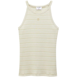 dark yellow/chalk white organic cotton fine ribbed horizontal stripe print embroidered monogram to the front halterneck sleeveless racerback straight hem This item is made from at least 50% organic materials. Learn more about what makes a product Conscious on our Conscious Criteria page Striped tank top Size and Fit - This piece fits true to size. We recommend you get your regular size. Model is 1,75m / 5ft 8in wearing size S