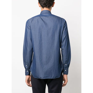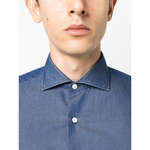long-sleeve denim shirt from FINAMORE 1925 NAPOLI featuring navy blue, cotton, spread collar, front button fastening, long sleeves, buttoned cuffs and rear curved hem. Regular fit denim shirt Size and Fit - This piece fits true to size. We recommend you get your regular size. Model is 1,84m / 6ft 1in wearing size 39 (COLLAR CM)