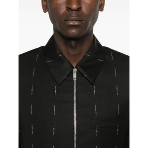 logo-print shirt jacket from Givenchy featuring black, all-over logo print, classic collar, front zip fastening, long sleeves, chest welt pocket and straight hem. Wool zipped jacket Size and Fit - This piece fits true to size. We recommend you get your regular size. Model is 1,84m / 6ft 1in wearing size 48 (IT)