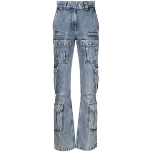 light blue cotton denim panelled design silver-tone logo plaque belt loops concealed front fastening bootcut two side slit pockets two front welt pockets multiple cargo pockets two rear welt pockets straight hem Cargo denim cotton jeans Size and Fit - This piece fits true to size. We recommend you get your regular size. Model is 1,75m / 5ft 8in wearing size 27 (WAIST CM)