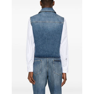 indigo blue denim embroidered logo at the chest classic collar front press-stud fastening sleeveless two side zip-fastening pockets front flap pocket straight hem full lining Denim cotton vest Size and Fit - This piece fits true to size. We recommend you get your regular size. Model is 1,84m / 6ft 1in wearing size M