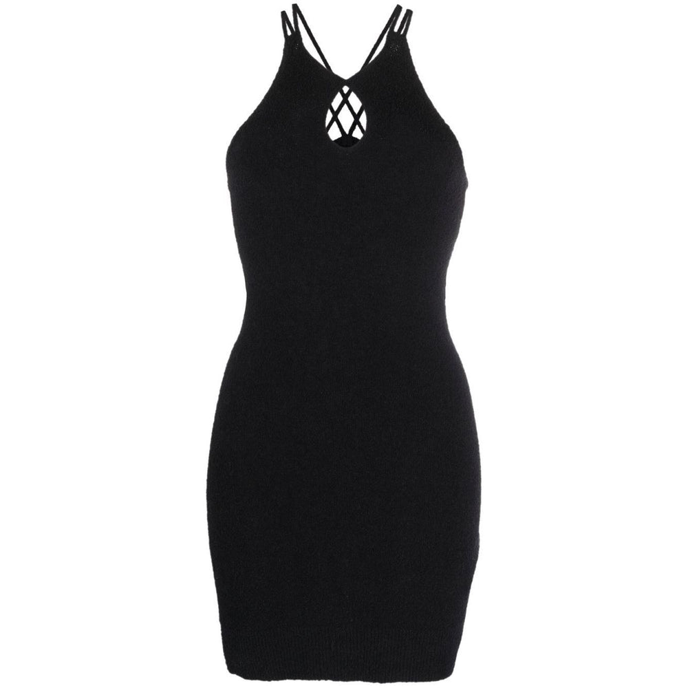 halterneck knitted dress from IRO featuring black, cotton blend, knitted construction, slip-on style, halterneck, keyhole neck, rear criss-cross straps, thigh-length and ribbed hem. Cotton blend short dress Size and Fit - This piece fits true to size. We recommend you get your regular size. Model is 1,75m / 5ft 8in wearing size S