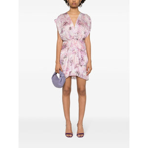 ecru/light pink silk all-over floral print V-neck cap sleeves fitted waistline ruched detailing asymmetric hem concealed side zip fastening Floral print silk short dress Size and Fit - This piece fits true to size. We recommend you get your regular size. Model is 1,75m / 5ft 8in wearing size 36 (FR)