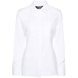 white cotton poplin texture classic collar long sleeves with buttoned cuffs chest patch pocket triangular open back with adjustable belt straight hem front button fastening La Chemise De Costume shirt Size and Fit - This piece fits true to size. We recommend you get your regular size. Model is 1,75m / 5ft 8in wearing size 36 (FR)