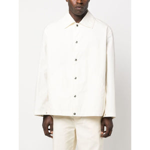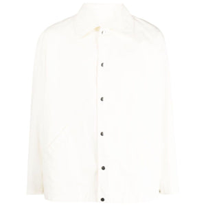 logo-print cotton shirt jacket from JIL SANDER featuring bone white, cotton, logo print to the rear, cutaway collar, front press-stud fastening, long sleeves, two side welt pockets and straight hem. Logo cotton jacket Size and Fit - This piece fits true to size. We recommend you get your regular size. Model is 1,84m / 6ft 1in wearing size 48 (IT)