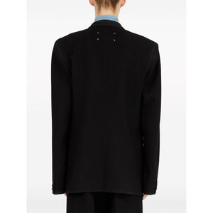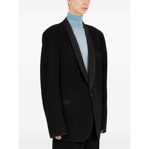 black wool signature four-stitch logo satin trim shawl collar front button fastening long sleeves chest welt pocket two front jetted pockets straight hem Wool single-breasted blazer jacket Size and Fit - This piece fits true to size. We recommend you get your regular size. Model is 1,75m / 5ft 8in wearing size 40 (IT)