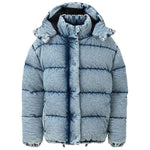 Puffy down jacket in Miu Miu denim. Covered front zipper and button closure, two zippered side pockets, removable hood.Applied logo on back. Puffy pattern, fully padded, elastic cuffs and adjustable drawstring waist. Inner SKU: 24 LU 10. Composition: 100% Polyester-Inner SKU:24LU10