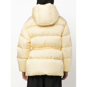 side-stripe puffer jacket from PALM ANGELS featuring pastel yellow, feather down, padded design, side stripe detailing, embroidered logo at the chest, classic hood, front zip fastening, drawstring waist and two side zip-fastening pockets. Belted down jacket Size and Fit - This piece fits true to size. We recommend you get your regular size. Model is 1,75m / 5ft 8in wearing size S