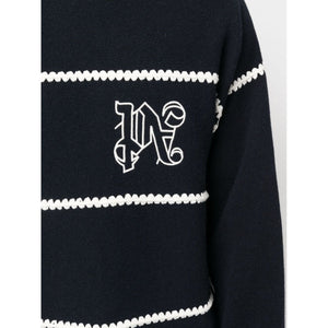 embroidered-monogram striped jumper from PALM ANGELS featuring navy blue, wool blend, knitted construction, horizontal stripe pattern, contrasting trim, embroidered logo at the chest, crew neck, long sleeves and straight hem. Monogram wool sweater Size and Fit - This piece fits true to size. We recommend you get your regular size. Model is 1,84m / 6ft 1in wearing size M