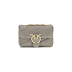 Calfskin Love Baby Shoulder Bag by Pinko, front closure with magnetic button, iconic gold-plated Love Birds logo embossed on the front, quilted and padded design, double internal compartment, sliding chain shoulder strap, iconic brand monogram embroidered tone-on-tone on the back.