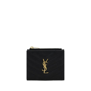 Calfskin Wallet by Saint Laurent, matelassé design, embossed iconic monogram plaque on front, snap-button closure, interior card slot and bill compartment, zippered slot pocket on top.