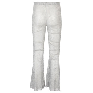 Silver trousers, leg leg, transparent, elasticized life. Flare leg trousers Size and Fit - This piece fits true to size. We recommend you get your regular size. Model is 1,75m / 5ft 8in wearing size S